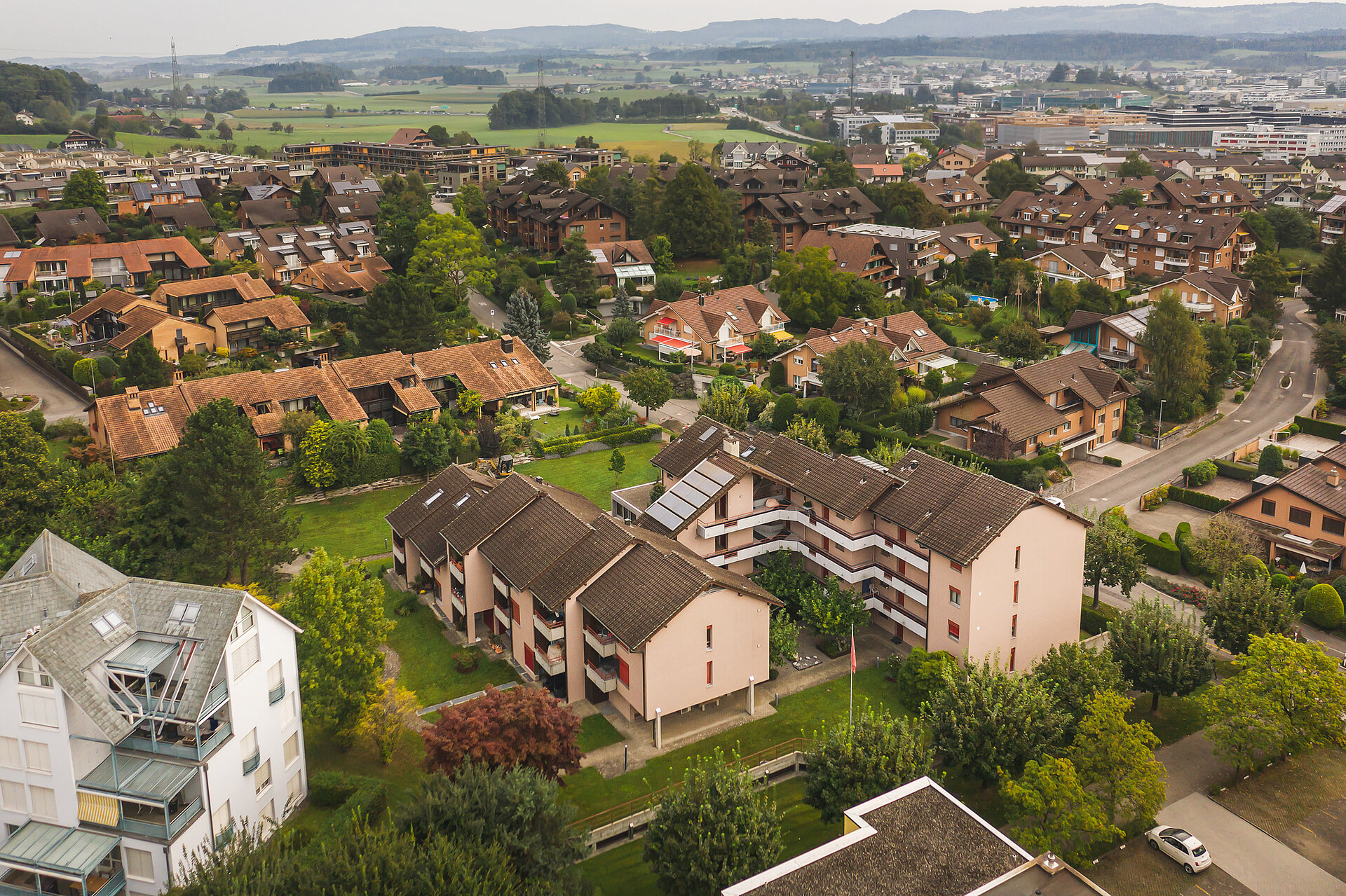 Das 1983 erstellte Mehrfamilienhaus der GBC an der Mugerenstrasse 5 in Cham bietet 34 hauptsächlich altersgerechte Kleinwohnungen. 2014 wurde die nördliche Fassade gedämmt, die Bäder und Küchen wurden erneuert und zwei zusätzliche Wohnungen eingebaut.