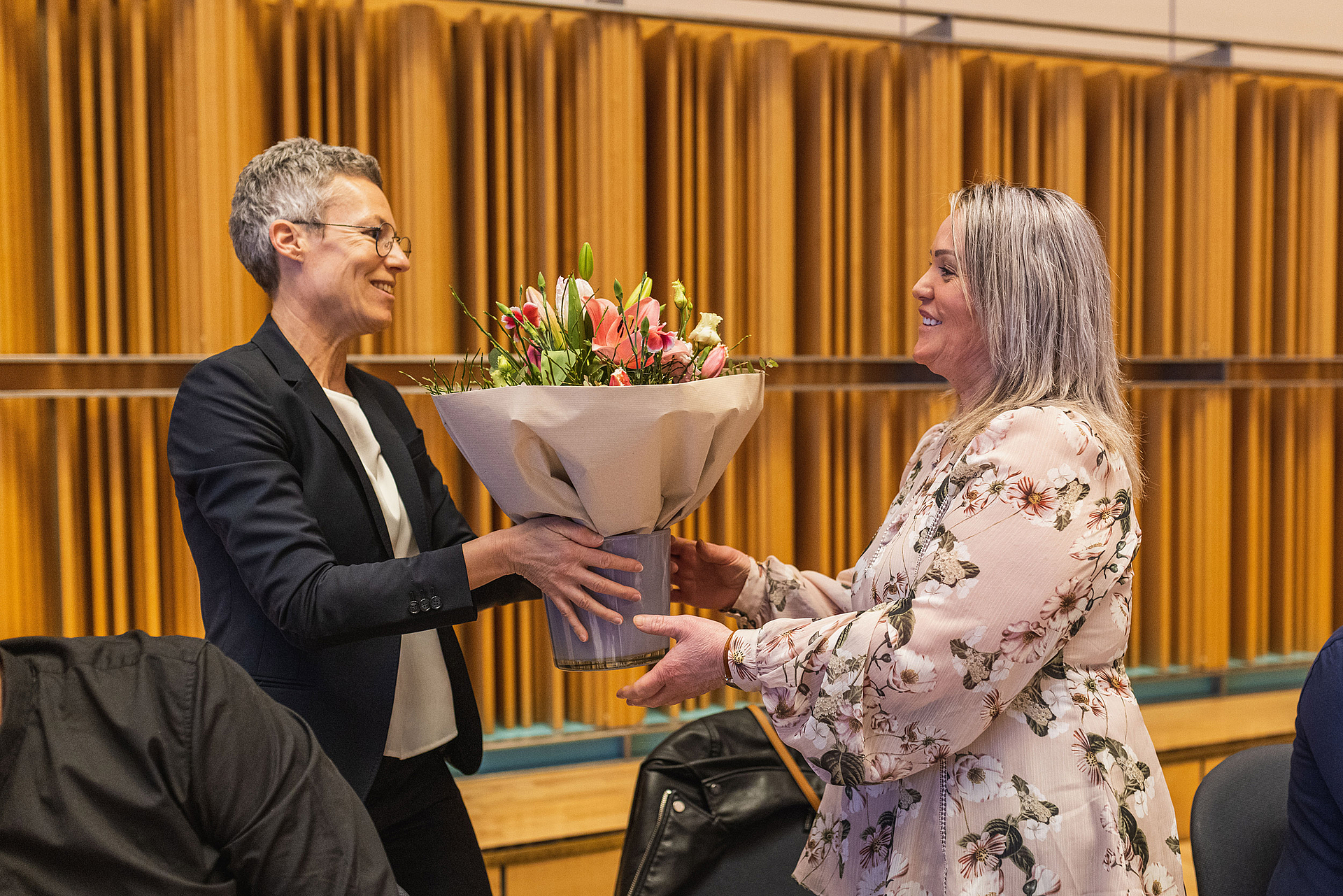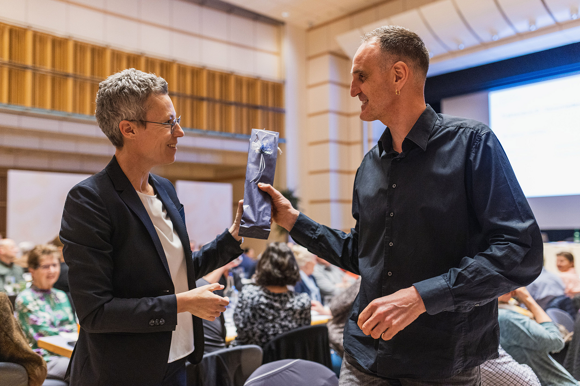 Anschliessend ehrte Tanja Süssmeier, seit November 2022 neue Geschäftsführerin der GBC, Elmije Turjan und Hannes Gisler, für ihr seit 10 Jahren sehr engagiertes Wirken im Dienst der GBC. Elmije Turjan ist für die Reinigung der Treppenhäuser und allgemeinen Räume der GBC-Liegenschaften im Seeblick zuständig und Hannes Gisler für die Laubengänge sowie die Tiefgarage an der Mugerenstrasse 5.