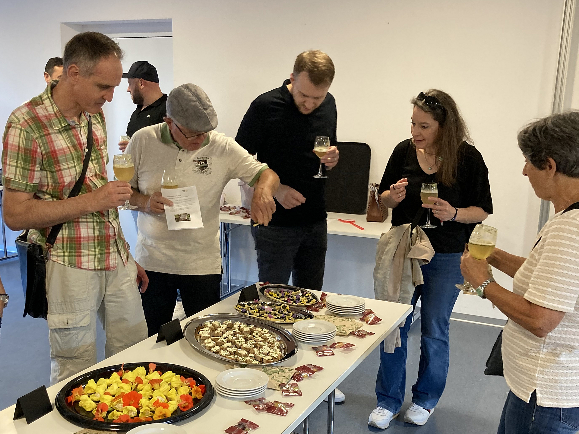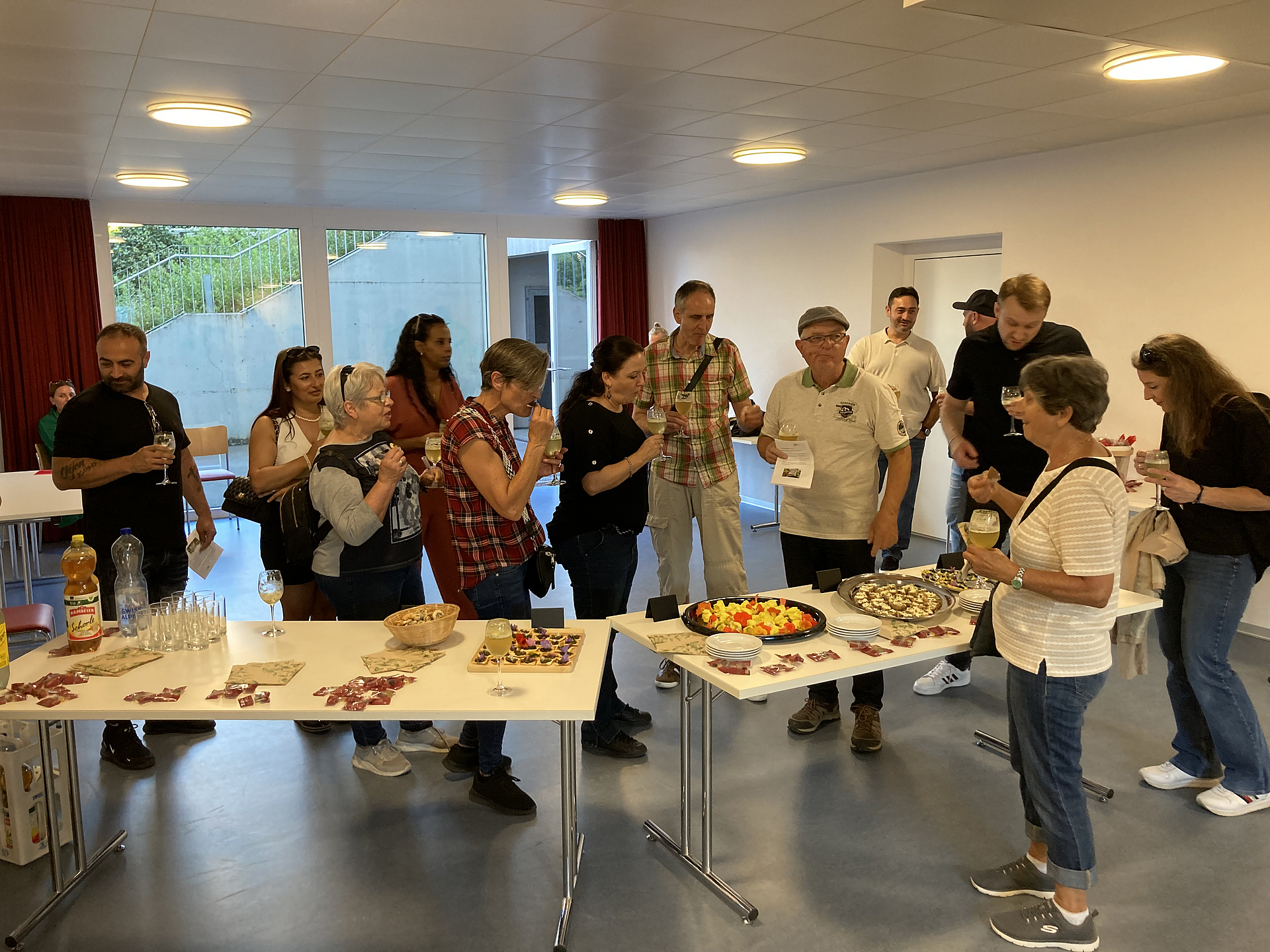 Der Spaziergang regte zum Austausch an. Dieser wurde bei einem Wildkräuterapéro im Gemeinschaftsraum Schluecht weitergeführt: Käse mit Brennnesselkonfi, gefüllte Nachtkerzenblüten, Cracker mit Spitzwegerichpesto und Brennnesselsamen-Prussiens. Dazu ein Drink mit Vogelbeerensirup und feinen Tannennadeln. Was erst auf etwas Skepsis stiess, wurde dann mit viel Neugierde probierte und als köstlich befunden.