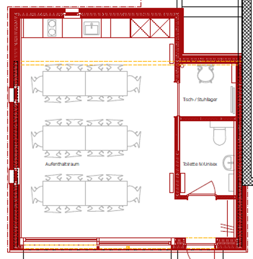 Geplant ist ein Aufenthaltsraum für 30 Personen, eine Küche, ein behindertengerechtes WC sowie ein Abstellraum für Tische und Stühle.