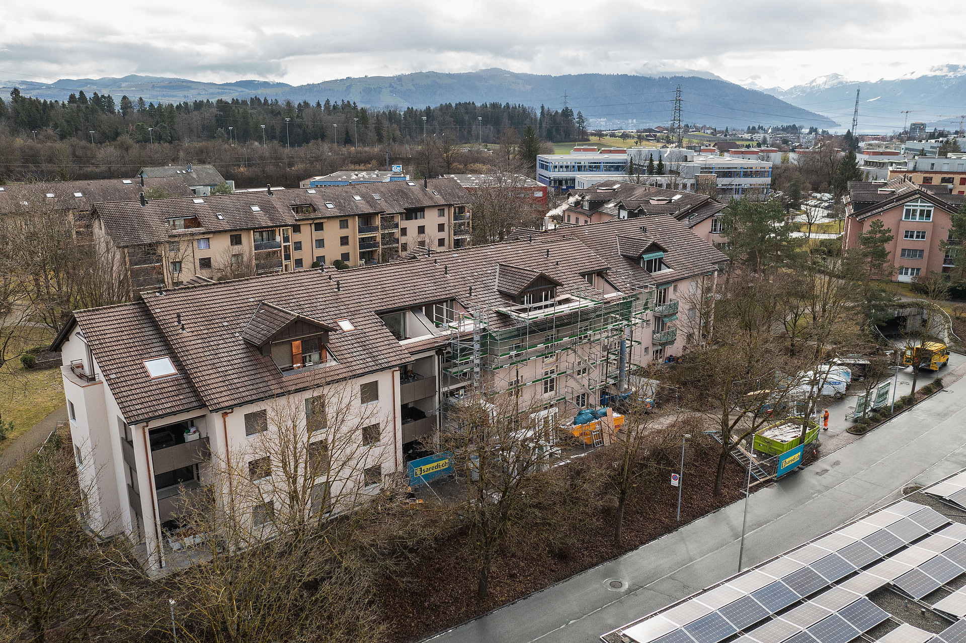 Die dritte und letzte Etappe der Gesamtsanierung Langacker ist im Gang. Am 11. Juli begannen die Bauarbeiten am Haus Nr. 10. Wie schon bei Etappe 1 und 2 werden auch hier Küchen und Nasszellen erneuert, Böden neu verlegt, Fenster und Storen ersetzt sowie die Fassadenisolation verbessert. Für die Warmwasseraufbereitung werden thermische Sonnenkollektoren eingesetzt.