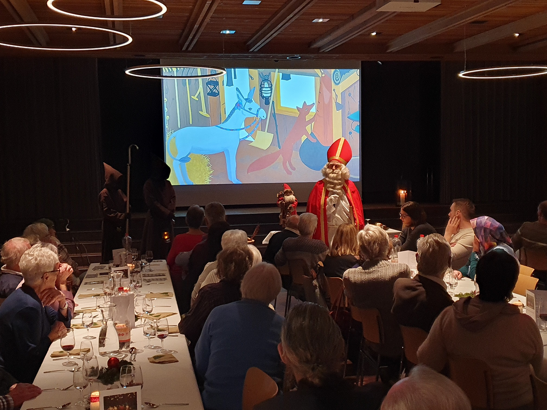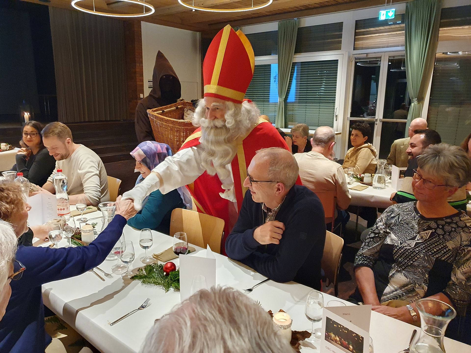 Nach der schmackhaften Vor- und Hauptspeise war es Zeit für die Überraschung. Der Samichlaus, begleitet von zwei Schmutzlis, betrat den Raum und sprach zur Gästeschar. Der Samichlaus hatte sich sehr gut über die GBC informiert und wusste zum Beispiel, dass die GBC kürzlich einen neuen Gemeinschaftsraum eingeweiht hatte. Er erzählte dann eine herzerwärmende Geschichte. Und zum Abschluss gab es vom Samichlaus für alle Teilnehmenden ein Samichlaussäckli und die besten Wünsche für die Adventszeit.